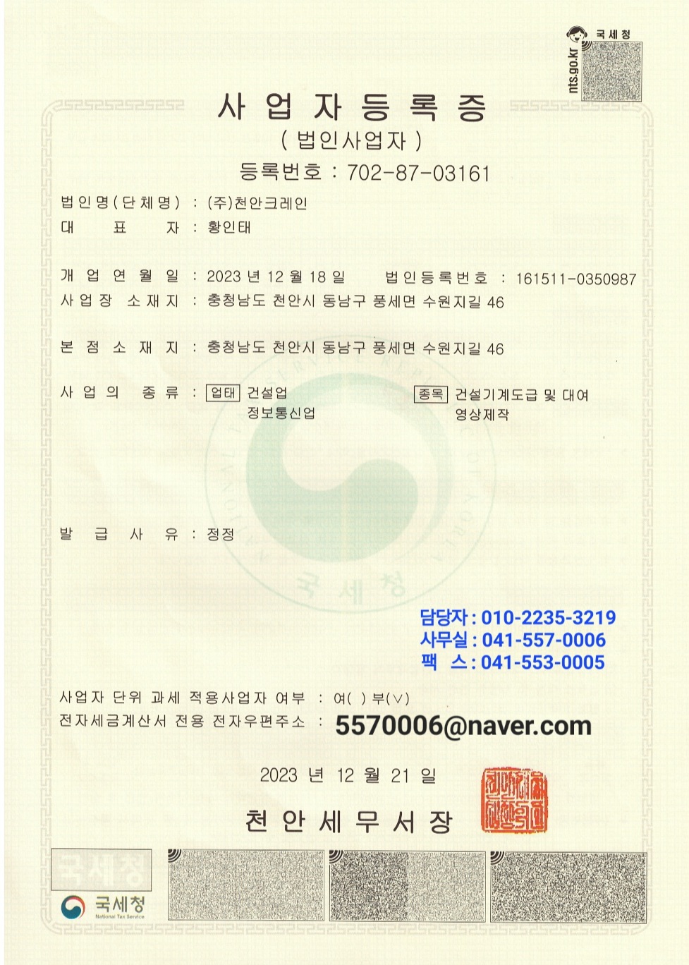 사업자등록증 페이지 정보 작성자. (주)천안크레인 작성일26-01-20 20:24 조회17회 댓글0건 이전글 다음글 목록 본문 事業字 댓글목록 등록된 댓글이 없습니다. 이전글 다음글 목록